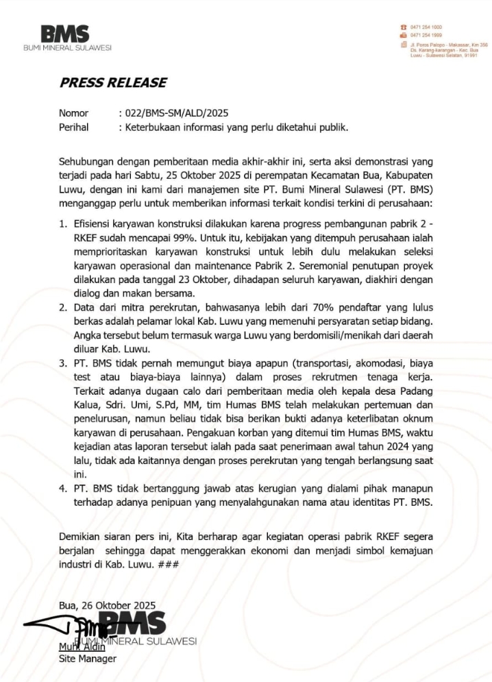 LUWU,VoiceNews.id – Sehubungan dengan pemberitaan media akhir-akhir ini, serta aksi demonstrasi yang terjadi pada hari Sabtu, 25 Oktober 2025 di perempatan Kecamatan Bua, Kabupaten Luwu, dengan ini kami dari manajemen site PT. Bumi Mineral Sulawesi (PT. BMS) menganggap perlu untuk memberikan informasi terkait kondisi terkini di perusahaan: