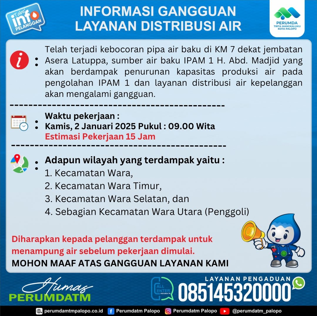 “Pelayanan air bersih akan didistribusikan secara bergilir mulai tanggal 18 Januari 2025 pukul 20.00 WITA hingga perbaikan selesai. Penggiliran ini akan terus berlangsung hingga kondisi normal kembali,” kata Novita Sari.