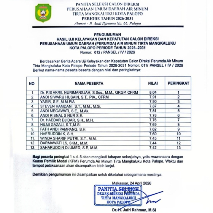 PALOPO,VoiceNews.id – Pemerintah Kota Palopo memastikan seleksi Direksi Perumda Tirta Mangkaluku dilaksanakan secara profesional, objektif, transparan dan bebas intervensi.